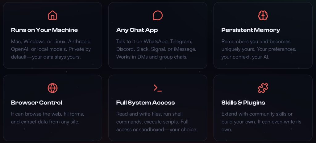 公式サイトの情報からは、OpenClawが「普段使っているチャットアプリ」をそのまま操作画面として使えることを重視している点が読み取れます。新しい専用画面を覚える必要がなく、WhatsAppやTelegram、Slackなど日常的に使っている環境でそのまま指示できるため、AIに不慣れな人でも導入の心理的ハードルが低いと考えられます。