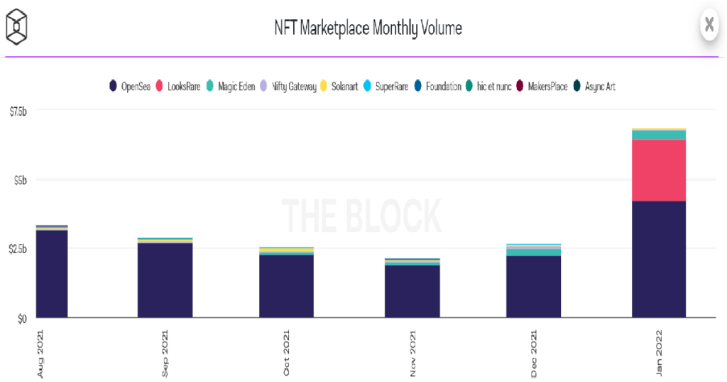 下の図を見てもらっても分かる通り、OpenSeaの一強だったところから、徐々に分散されてきました。特に「LooksRare」が台頭してきています。