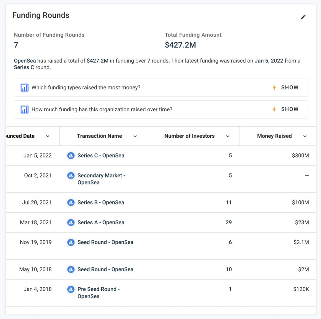 OpneSeaは全7回、合計427.2Mドル(約560億円)の資金調達を行ってきました。