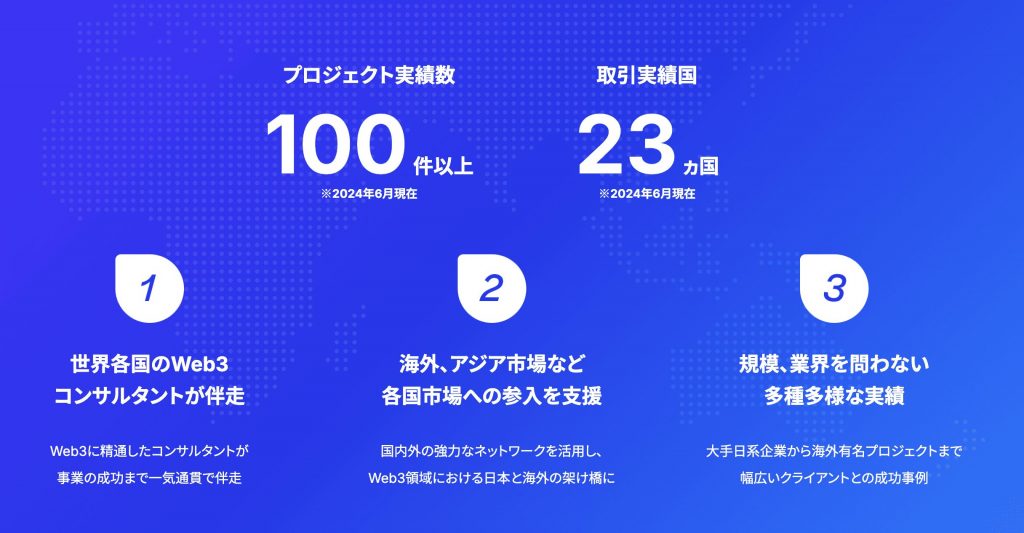 世界各国のWeb3に特化したコンサルタントがプロジェクトの成功に向けて伴走し、専門知識を持つコンサルタントが、立ち上げから実現まで一貫したサポートを提供することが特徴です。大手日系企業から海外の著名なプロジェクトまで、多岐にわたるクライアントにサービスを提供し、Web3領域における市場拡大へ貢献しています。