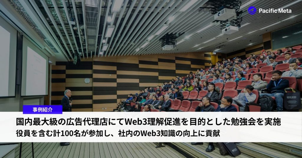 Pacific Metaは、クライアントの目的に合わせた勉強会を開催し、Web3の基礎知識の解説に加えて、実践的なスキルが習得できる体験型ワークショップを提供しました。また、クライアントが進めるWeb3関連事業の営業活動を支援するために、講師派遣や資料提供などを行いました。この支援により先端的な知識を社内に浸透させるだけでなく、新たなビジネス案件の獲得にも貢献しました。