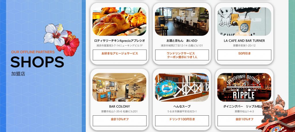 kukurunにてPASS NFTを購入することで、オフライン特典が付与され、沖縄現地の飲食店や宿泊施設、観光サービスなど数百店舗規模の加盟店でクーポンとして利用することができます。