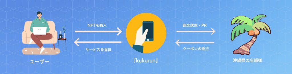 kukurunとは、「Web3オンラインサービス」×「沖縄現地のオフラインサービス」を融合したWeb3プラットフォームであり、沖縄県から日本の観光を新しい形で体験できるこのWeb3プラットフォームにより持続的なコンテンツとなるサービスを提供し、沖縄県の観光促進や雇用創出、地方経済振興を担っていくような、沖縄弁の「心=くくる」と「ルンルンと楽しくなる」という意味を込めた「心踊るプラットフォーム」を目指しています。
