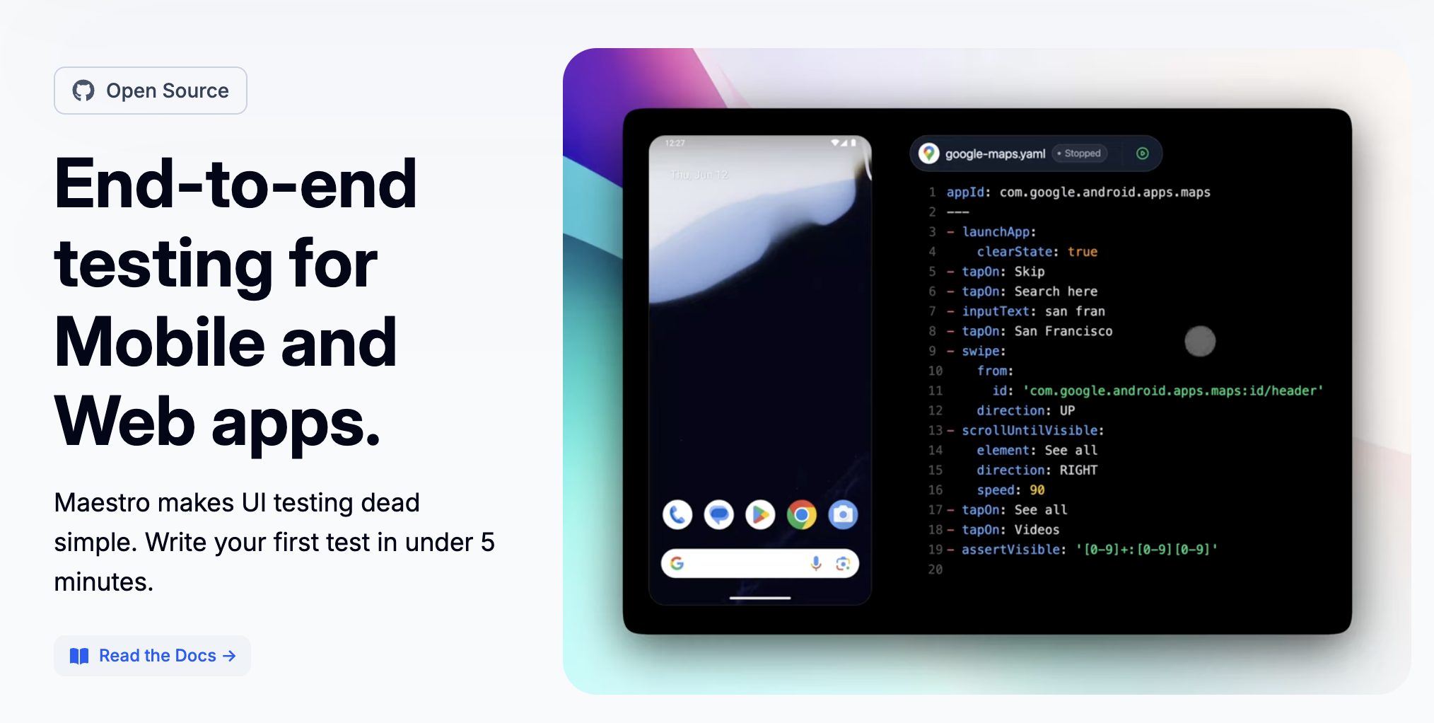 Maestroは、この流れを現実的なものにするツールの一つです。特徴的なのは、テストを特別な専門作業にせず、開発の延長線上で扱える点です。テスト内容はYAML形式で記述され、人が読んでも理解しやすい構造になっています。そのため、テストコードだけがブラックボックス化することを防ぎ、チーム全体で内容を共有しやすくなります。