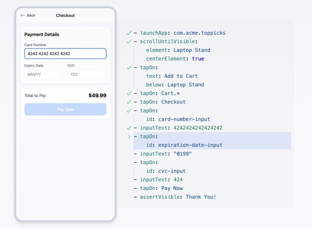Maestroは、この流れを現実的なものにするツールの一つです。特徴的なのは、テストを特別な専門作業にせず、開発の延長線上で扱える点です。テスト内容はYAML形式で記述され、人が読んでも理解しやすい構造になっています。そのため、テストコードだけがブラックボックス化することを防ぎ、チーム全体で内容を共有しやすくなります。