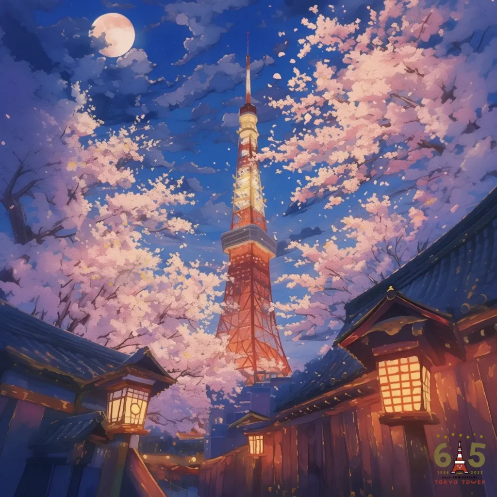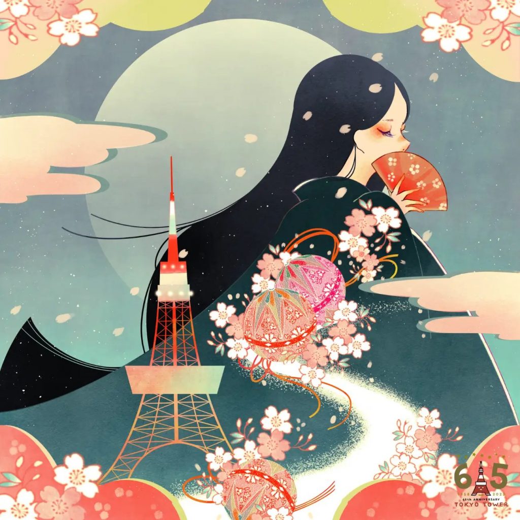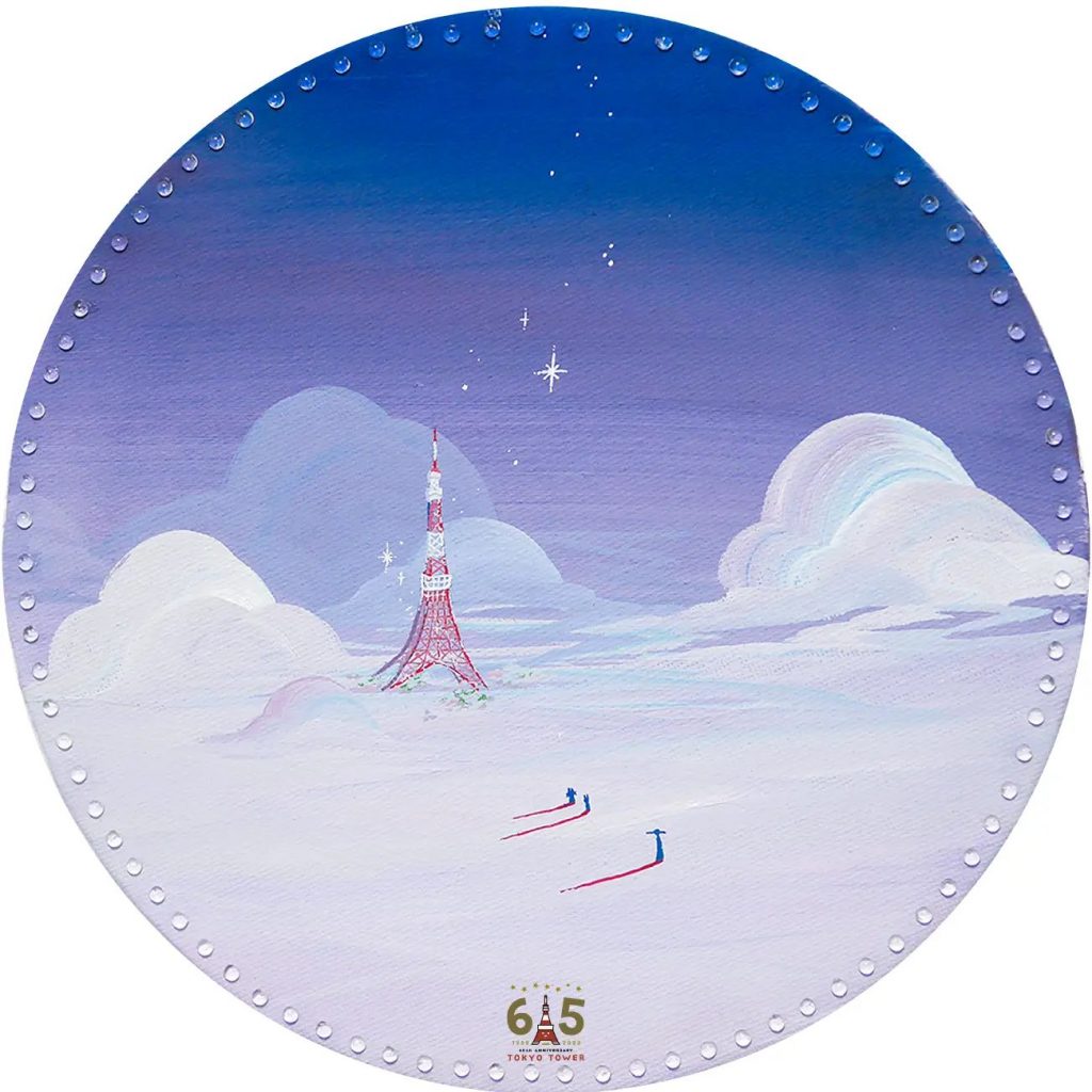 コメント:開業65周年おめでとうございます。この作品では東京タワーを中心とし、国花である桜、全面が輝く満月、古都の風景の3つで彩ることで