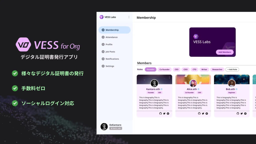 VESS for Orgは現在クローズドβ版で運営されていますが、法人が簡単にデジタル証明書を発行できるアプリケーションです。在籍証明やイベント参加証明などをノーコード&手数料0円で発行ができます。