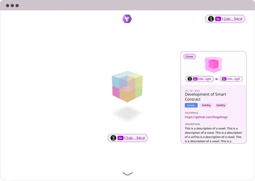 - 各プラットフォームや組織で実績証明のオンチェーン上に発行(Voxelと表現)