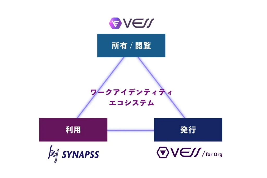 - そのために、プロトコルの「VESS」、企業が簡単にデジタル証明書を発行できる「VESS for Org」、発行されたデジタル証明書を所有&閲覧できる「VESS Resume」、デジタル証明書を活用してweb3人材の採用ができる「SYNAPSS」を開発している。