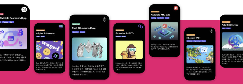 教材自体はテキストベースであり、内容もNFTの発行やMessenger、wallet開発と様々であり、public chainの種類もEthereum、polygon、Avalanche、solana、nearと多岐に渡ります。