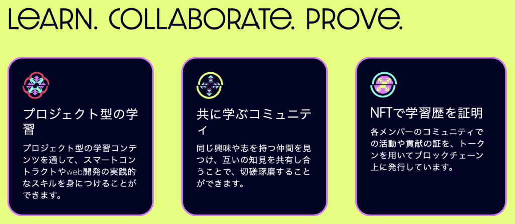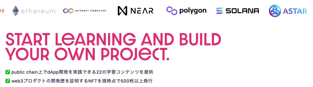 特徴としては、public chain上でdApp開発を実践できる22の学習コンテンツの提供やWeb3プロダクトの開発歴を証明するNFTを現時点で500枚以上発行している点です。