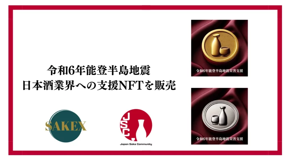 2024年の元日に石川県能登地方で観測された最大震度7の地震により被災された酒蔵の支援するため、支援NFTの販売を開始することを発表しました。集まった支援金は、日本酒業界の支援へ使わせていただく予定とのことです。
