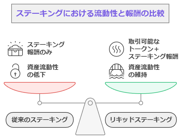 従来のステーキングでは、預けた資産がロックされて一定期間運用できなくなる仕組みでした。一方、「リキッドステーキング」では仮想通貨をステークすると、代わりにトークン(LST)が貰えるため、そのトークンですぐに取引ができる流動性が魅力です。