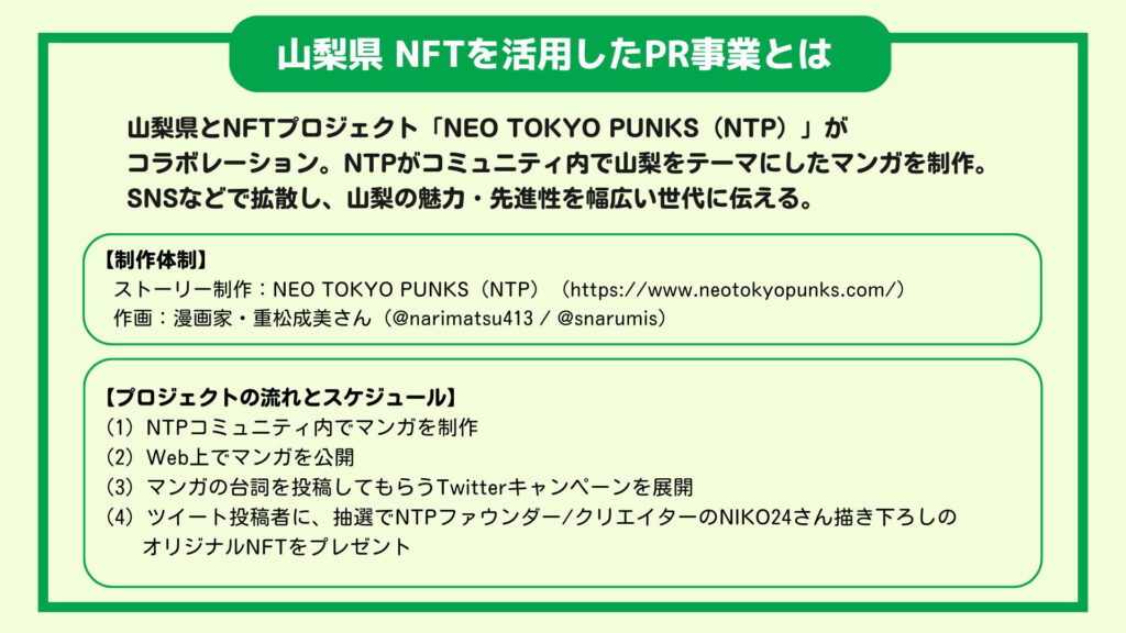 今回の山梨県とNTPは「ユーザー参加型PR」でコラボしています。ふるさと納税×NFTや行政のオリジナルアートの制作及び配布などは今までもコラボしている事例がありましたが、NFTプロジェクトと行政がPR文脈でコラボする事例は国内初です。
