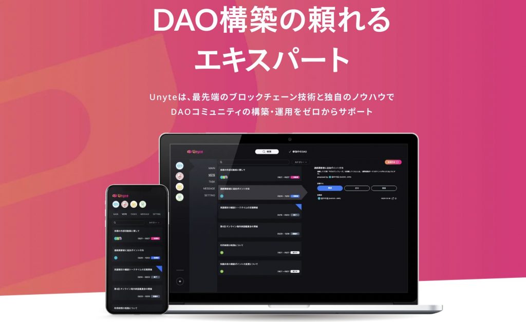 Unyteは、NFTの発行からデータの暗号化を用いた秘密投票、さらには貢献実績のオンチェーン保存まで対応できる、DAOに特化したプラットフォームサービスです。活動に応じたトークンや投票権の分配機能を備えており、DAOコミュニティに必要な一連のプロセスをワンストップでサポートするものです。